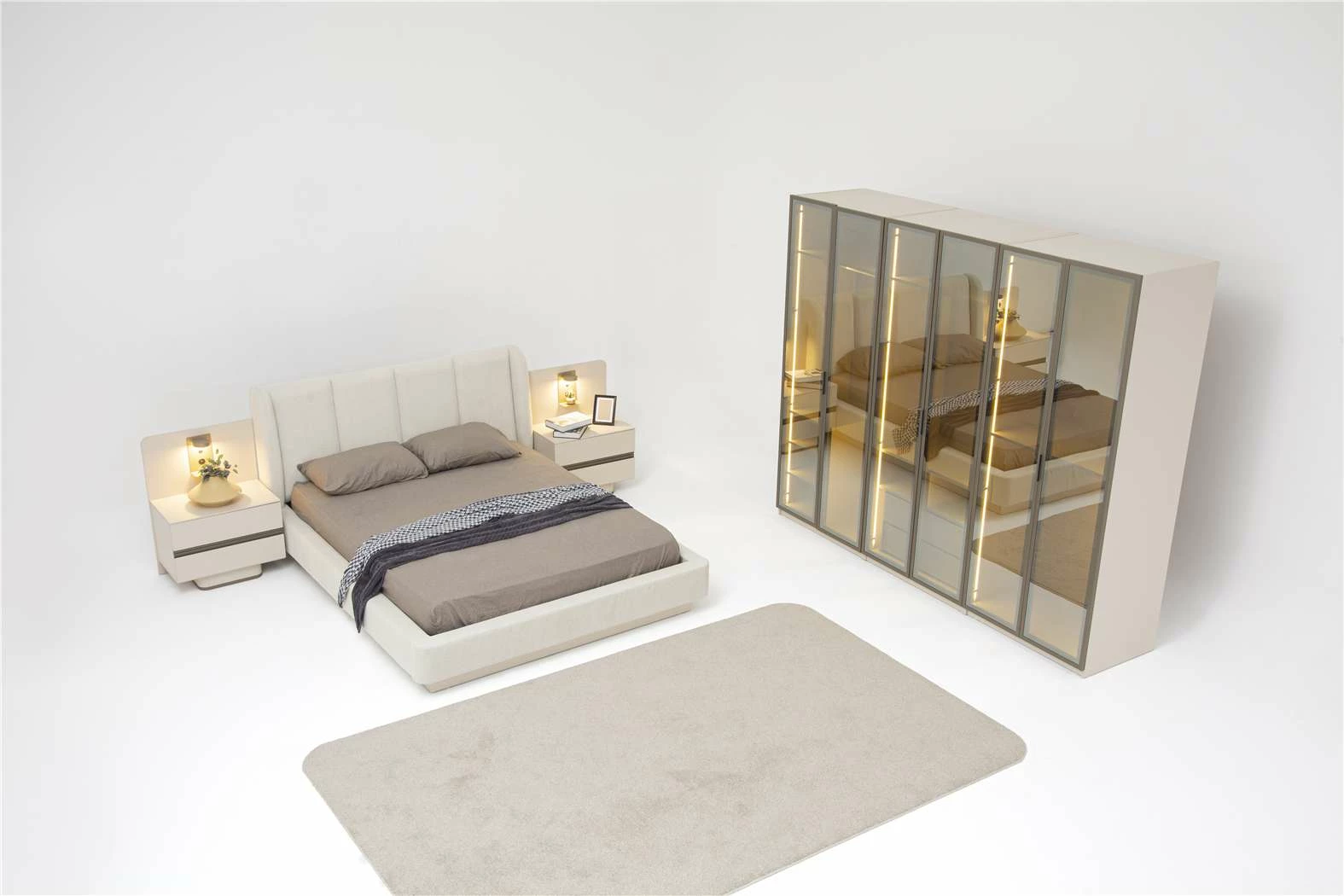 Takım İçeriği: 6 Kapaklı Gardrop(4 Ahşap kapak-2 Lens Kapak)-Bazalı Karyola(160x200)-Şifonyer Ve Ayna-Komodin(2 Adet) şeklindedir.