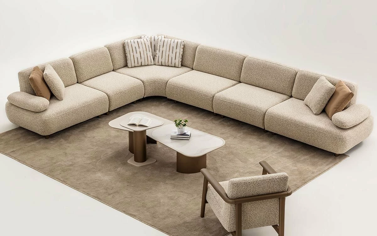 Takım içeriği 2 adet 125'lik Kollu Modül - 1 adet 90'lık Ara Modül - 1 adet Tepsili Puf - 1 adet Köşe Modül - 1 adet 70'lik Ara Modül (Yatak olabilir)