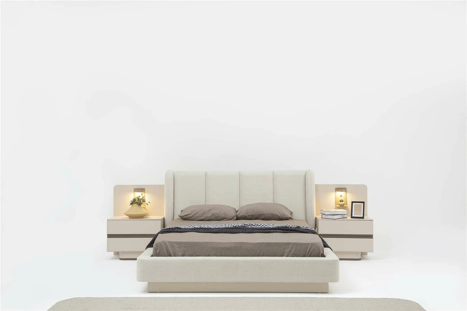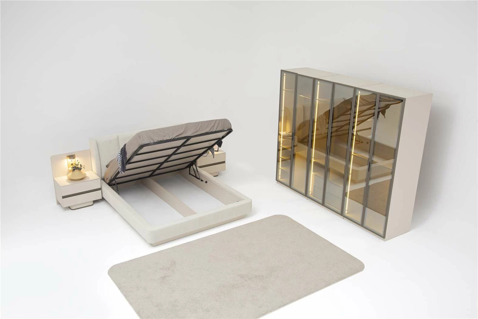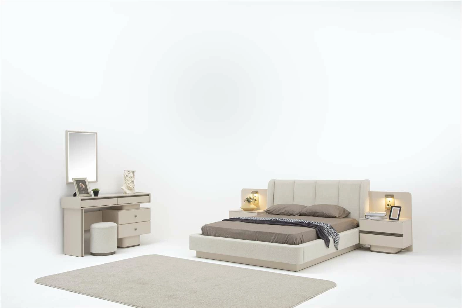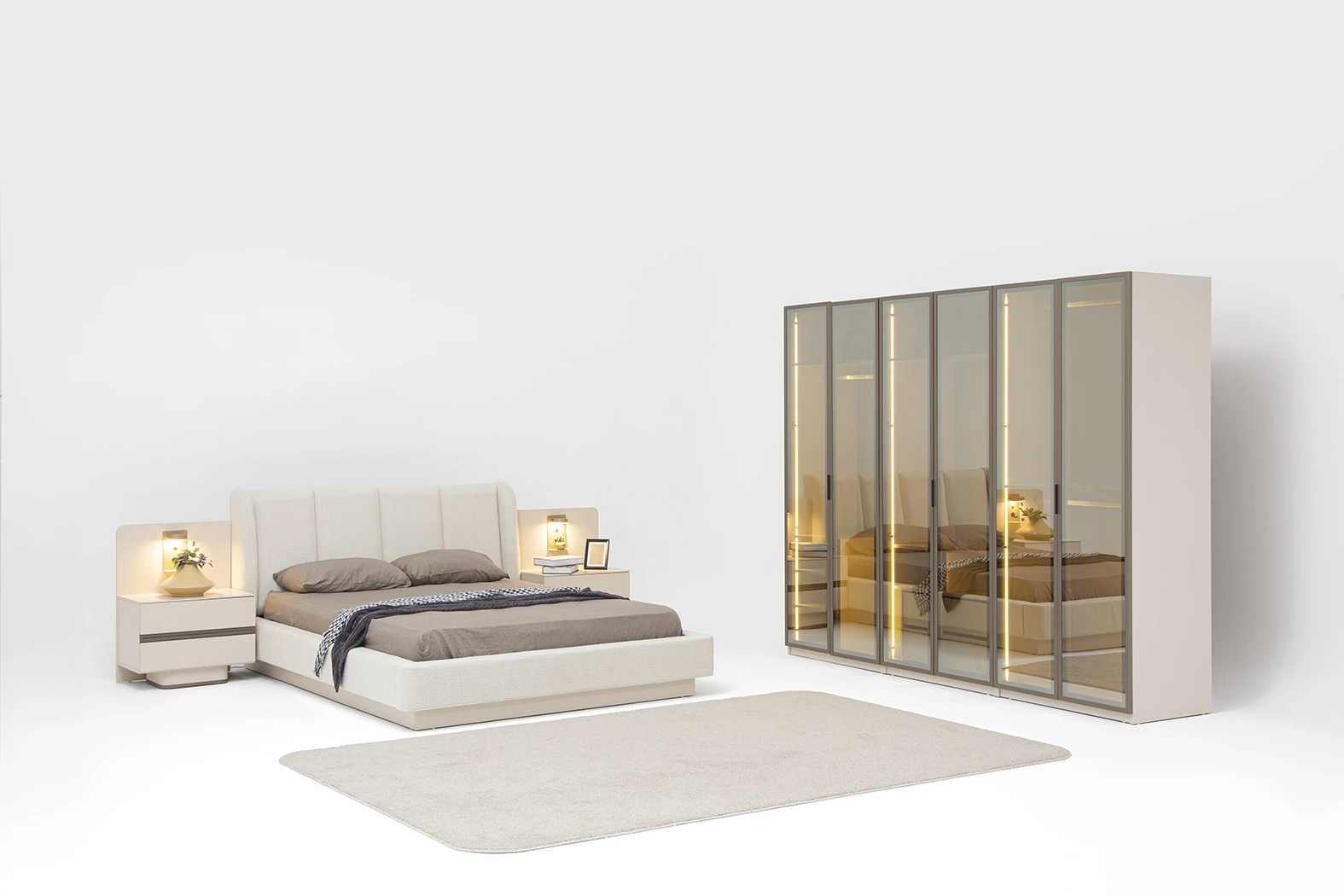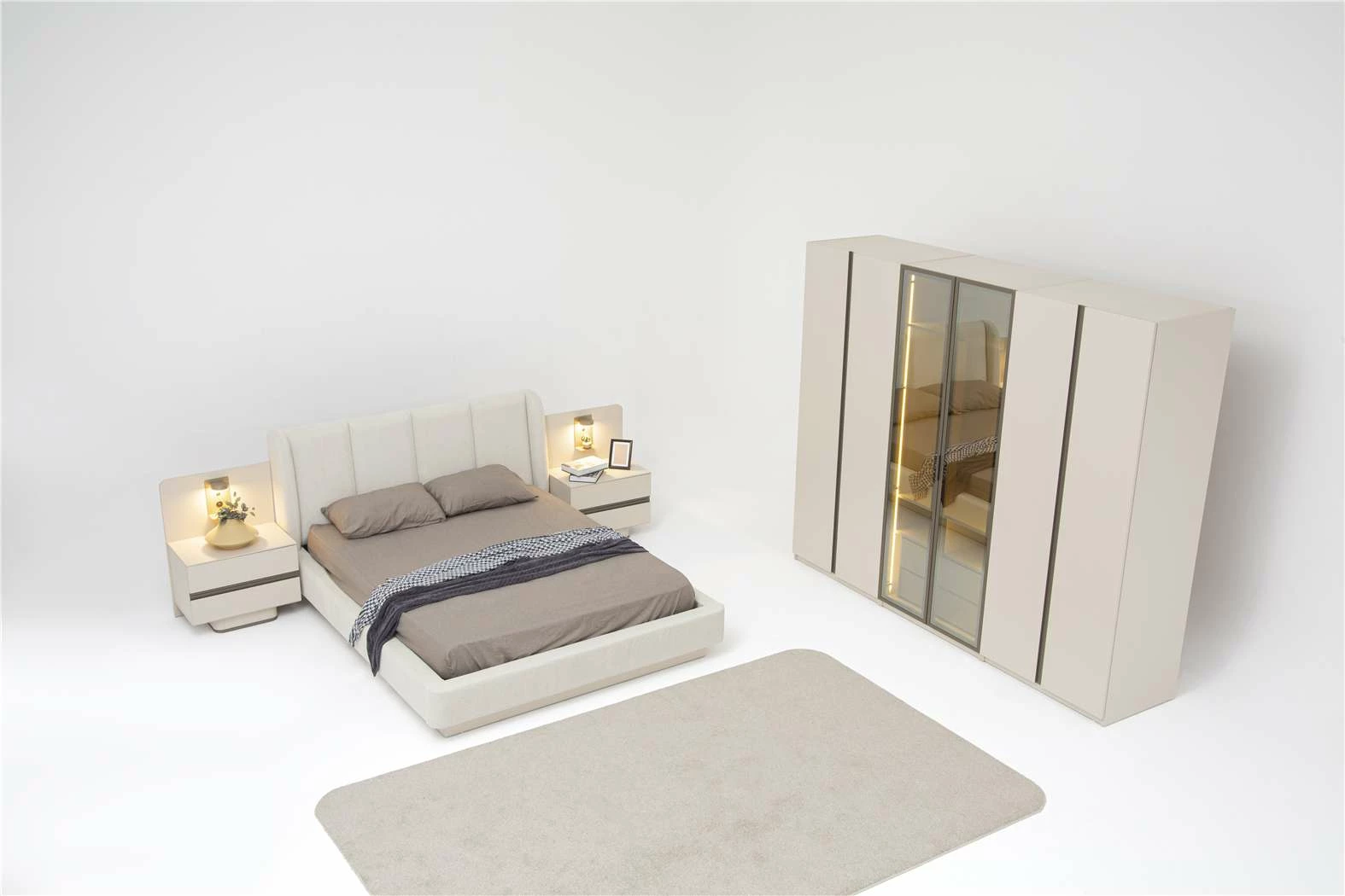 Takım İçeriği: 6 Kapaklı Gardrop(4 Ahşap kapak-2 Lens Kapak)-Bazalı Karyola(160x200)-Şifonyer Ve Ayna-Komodin(2 Adet) şeklindedir.